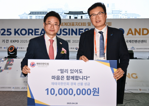 태국한인회 28일 안동에서 열린 `2025 월드옥타(World-OKTA) 세계대표자대회` 행사장에서 경북 지역 산불 피해복구를 위한 성금 1,000만원을 전달했다.