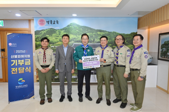 경북교육청 29일 본청 접견실에서 한국스카우트연맹(총재 이찬희)과 함께 최근 산불로 피해를 본 학생들을 지원하기 위해 기부금 1천만 원을 전달하는 행사를 가졌다.
