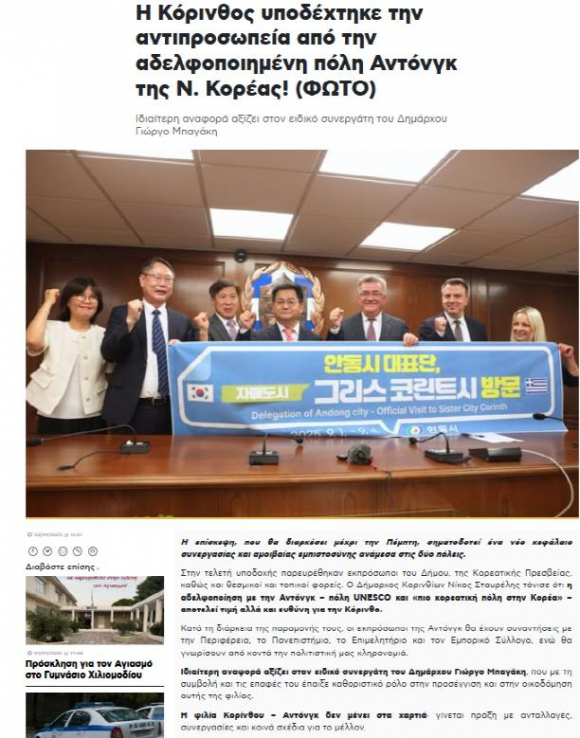 안동시는 지난 8월 30일부터 9월 8일까지 국제 교류와 우호 협력 증진을 위해 자매․우호도시인 그리스 코린트시와 이탈리아 아스티시를 공식 방문했다.