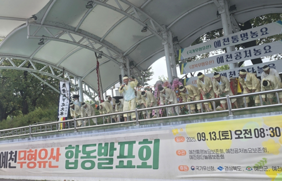 예천군은 13일, 통명농요보존회, 공처농요보존회, 청단놀음보존회가 주관한 ‘예천 무형유산 합동공연 행사’를 한천체육공원에서 성황리에 개최했다.