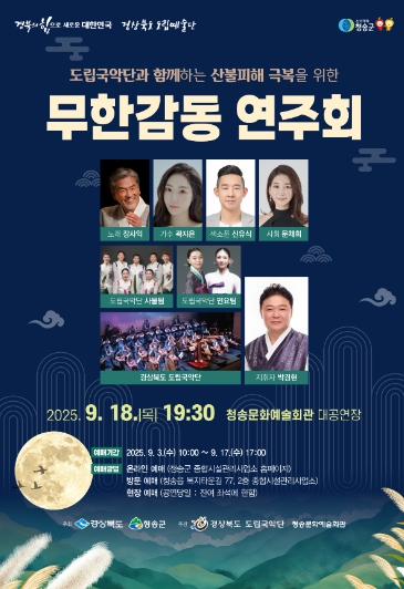 청송군은 오는 9월 18일 오후 7시 30분, 청송문화예술회관 대공연장에서 ‘도립국악단과 함께하는 산불 피해 극복을 위한 무한감동 연주회’를 개최한다.