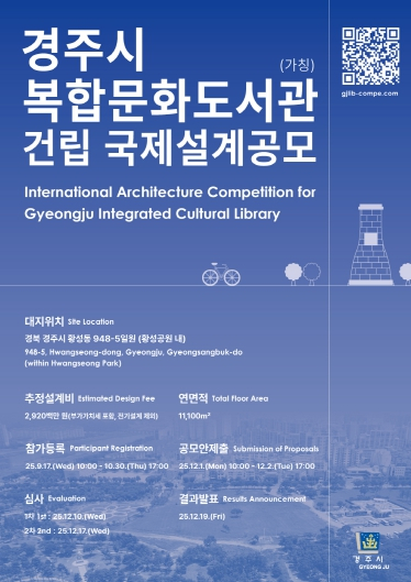 참가 등록은 오는 9월 17일부터 10월 30일까지 경주시 복합문화도서관 국제설계공모 홈페이지를 통해 가능하다.