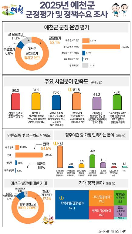 조사 결과, 응답자의 82.1%가 예천군의 군정 운영을 ‘잘하고 있다’고 평가했으며, 긍정적으로 평가한 응답자의 81.8%가 ‘주민 여가와 생활편의를 위한 공공시설 확충, 생활서비스 개선’ 분야에서 가장 높은 만족도를 보였다.