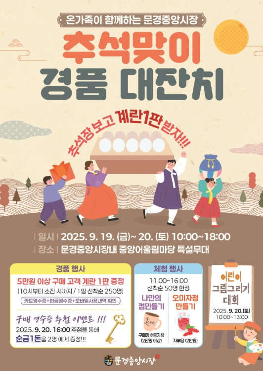 추석을 앞두고 열리는 큰 행사로 문경중앙시장 상인회원 점포에서 5만 원 이상 구매영수증 제출 고객에게(선착순 250명) 계란 1판을 증정한다.