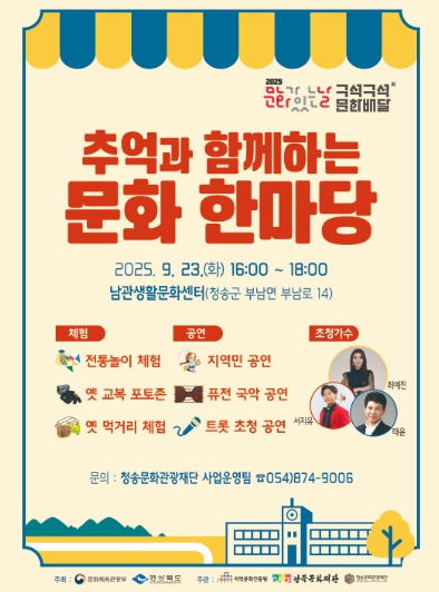 (재)청송문화관광재단은 오는 9월 23일 오후 4시부터 6시까지 부남면에 위치한 남관생활문화센터에서 2025 문화가 있는 날 ‘구석구석 문화배달’ 프로그램의 일환인 ‘추억과 함께하는 문화한마당’을 개최한다.