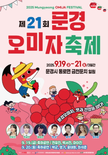 올해로 21회를 맞이하는 문경오미자축제는‘문경오미자, 맛과 건강을 담다!’라는 주제로 9월19일부터 21일까지 3일간 동로면 금천둔치에서 진행된다. 축제의 하이라이트인 개막식은 현역가왕 출신의 박서진, 전유진, 마이진 등 정상급 가수들의 축하 공연으로 특별한 밤을 선사하고, 20일에는 문경시 홍보대사인 박군, 영기, 주미 등이 분위기를 더욱 뜨겁게 달굴 예정이다. 폐막식이 열리는 21일에는 문경오미자 노래교실 경진대회를 비롯하여 박미영, 앵두걸스, 장혜진, 한혜정의 축하공연으로 축제 마지막 날 대미를 장식한다.