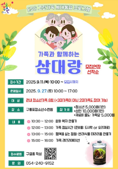 포항시청소년재단 구룡포청소년수련원은 오는 27일 지역 내 청소년과 가족 8가족을 대상으로 3세대가 함께하는 ‘ESG 그린 가족 세대통합 프로그램–삼대랑’을 운영한다.