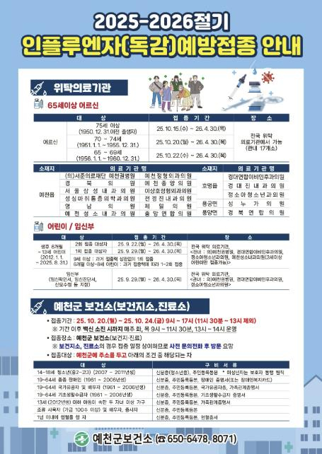 안남기 예천군보건소장은 “인플루엔자 예방접종은 개인은 물론 지역사회의 건강을 지키는 가장 효과적인 방법인 만큼, 대상자분들의 적극적인 접종 참여를 부탁드린다”고 말했다.