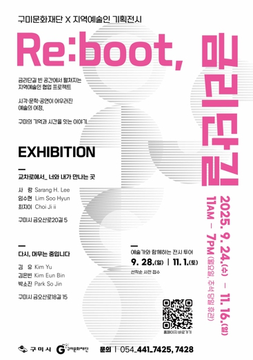 (재)구미문화재단은 지역 예술인들과 협업하여 구미의 대표 공간 중 하나인 금리단길을 새로운 시각으로 조명하는 `Re:boot, 금리단길` 전시를 개최한다.