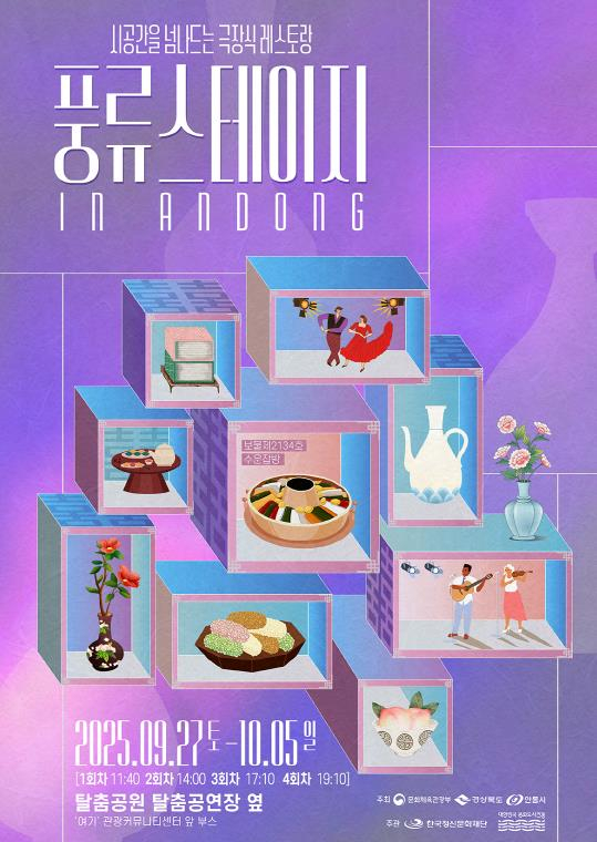 안동시와 한국정신문화재단은 대한민국 문화도시 조성사업의 일환으로 `풍류 스테이지 in Andong` 극장식 레스토랑을 오는 9월 27일부터 10월 5일까지 안동국제탈춤페스티벌 행사장에서 선보인다.