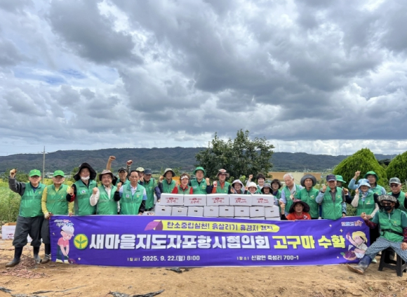이날 수확에는 김경휴 회장을 비롯해 읍면동 협의회장 35여 명이 참여해 구슬땀을 흘리며 ‘흙을 살리고, 환경을 살리고, 생명을 살리는’ 새마을정신을 실천했다.