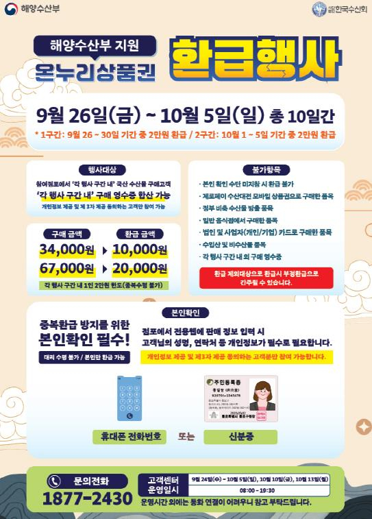우선 중앙신시장, 구시장, 용상시장에서는 수산물 온누리상품권 환급 행사가 열린다. 행사 기간은 9월 26일부터 10월 5일까지 10일간이며, 소비자는 수산물을 구입한 뒤 결제 영수증과 신분증을 지참해 각 시장별 환급처를 방문하면 구매금액에 따라 1인 최대 2만 원까지 온누리상품권을 환급받을 수 있다.