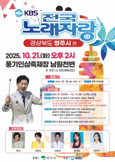 영주시는 오는 10월 21일 오후 2시, 풍기인삼축제장 남원천변에서 ‘KBS 전국노래자랑–영주시편’ 본선 녹화를 진행한다고 밝혔다.