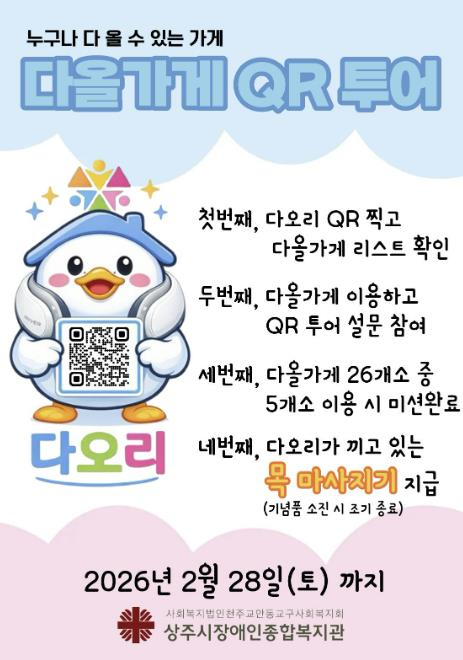 상주시장애인종합복지관은 1월 2일부터 2월 28일까지 지역 내 무장애 상가 이용을 활성화하기 위한‘다올가게 QR 투어’ 캠페인을 진행한다.