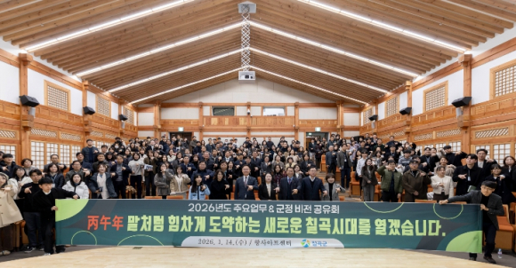 칠곡군은 지난 14일 향사아트센터에서 직원 200여 명이 참석한 가운데 ‘2026년도 주요업무 · 군정 비전 공유회’를 개최하여 부서별 비전과 핵심사업을 공유하고 소통하는 시간을 가졌다.