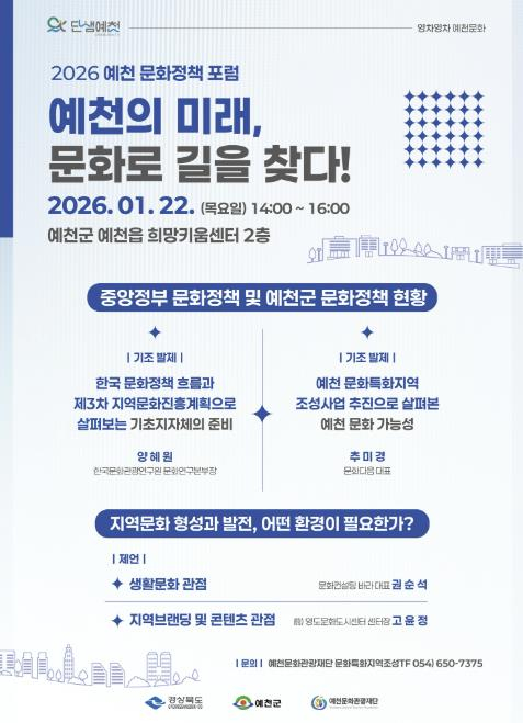 예천 문화특화지역 조성사업 `영차영차 예천문화`의 일환으로 추진하는 이번 포럼은 22일 ‘문화정책 포럼’을 시작으로 ‘협력 거버넌스 포럼’이 세 차례에 걸쳐 이어진다.