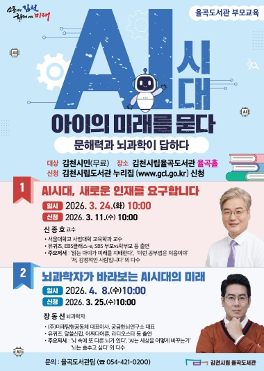 김천시립율곡도서관은 오는 3월 24일과 4월 8일 오전 10시, 율곡도서관 율곡홀에서 학부모를 대상으로 한 부모교육 특강 `AI 시대, 아이의 미래를 묻다`를 개최한다.