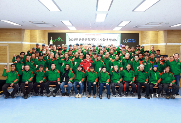 울진군은 지난 12일 군청 대회의실에서 근로자 80명을 최종 선발하고 2026년 공공산림가꾸기 사업단 발대식을 개최했다.