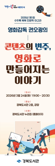 경북도서관은 3월 24일 저녁 7시, 도서관 2층 강당에서 영화감독 권오광을 초청해 ‘2026년 수두룩 북북 인문학 아고라’ 첫 번째 강연을 개최한다.