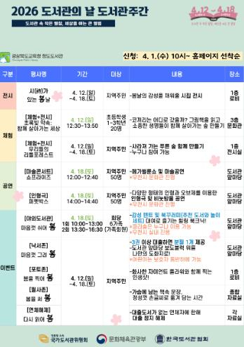 4월 1일부터 행사 참가 신청이 가능하며, 자세한 사항은 도서관 누리집을 참고하거나 도서관으로 문의하면 된다.