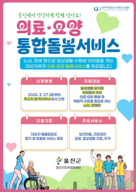 울진군은 3월 27일부터 의료, 요양, 돌봄 등 복합적인 지원이 필요한 노인, 장애인을 대상으로 의료요양 통합돌봄사업을 본격 시행한다.