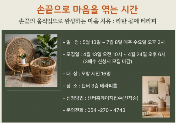 참여 신청은 오는 13일부터 24일까지 포항트라우마센터 홈페이지를 통해 선착순으로 접수한다.