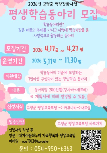 고령군은 지역 주민의 학습 열기를 확산하고 지속 가능한 학습 생태계를 조성하기 위해, 오는 4월 17일부터 27일까지 ‘2026년 고령군 역량강화 사업’의 일환인 `평생학습동아리` 10개 팀을 모집한다.