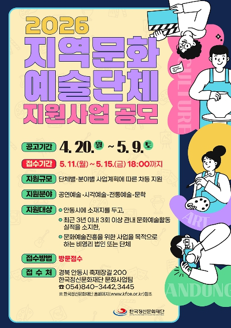 안동시 한국정신문화재단은 5월 11일부터 5월 15일 18시까지 관내 문화예술단체를 대상으로 ‘지역문화예술단체 지원사업’ 참여단체를 공개 모집한다.
