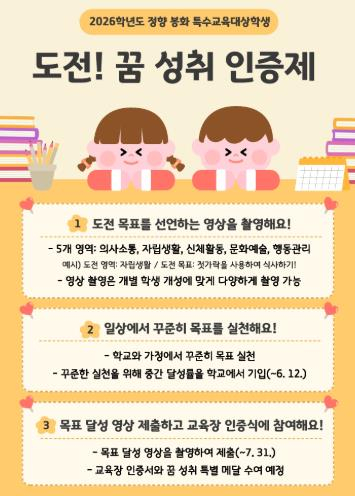 봉화교육지원청은 4월 20일 `장애인의 날`을 기념하여, 경상북도 내 최초로 특수교육대상학생의 특성을 반영해 전면 개편한 2026학년도 정향 봉화 특수교육대상학생 `도전! 꿈 성취 인증제` 참가 신청을 받고 본격적인 운영에 돌입한다고 밝혔다.