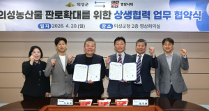 의성군은 4월 20일 군청 영상회의실에서 명랑시대외식청년창업협동조합과 의성 농특산물 판로 확대를 위한 상생협력 업무협약(MOU)을 체결하며 협력 관계를 이어간다고 밝혔다.