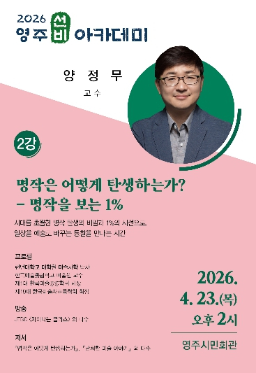 강연에 앞서 오후 1시 30분부터는 ‘아랑고고장구 영주지부’의 공연이 식전 행사로 진행될 예정이다. 강연은 별도의 사전 신청 없이 관심 있는 시민이면 누구나 선착순으로 무료 참여할 수 있다.