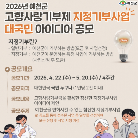예천군은 기부자가 사업 목적에 공감하고 직접 수혜 대상을 결정하는 ‘고향사랑 지정기부제’를 적극 도입하기로 하고, 그 첫걸음으로 4월 22일부터 5월 20일까지 `2026년 예천군 고향사랑기부제 지정기부사업 아이디어 공모전`을 열어 국민들의 참신한 제안을 받는다.