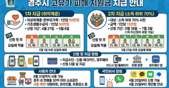 지급수단은 신용·체크카드 또는 경주페이 카드 중 선택할 수 있으며, 신청 다음 날 지급된다.