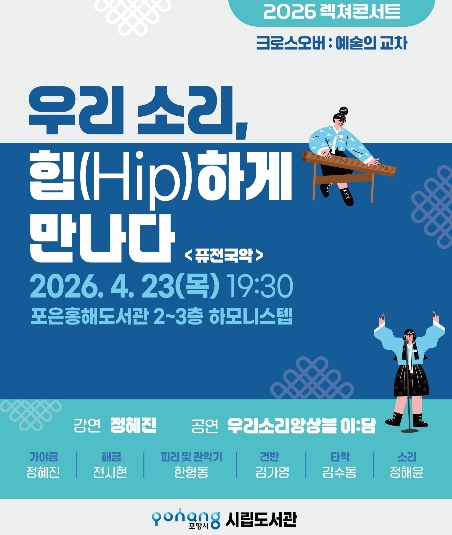 포항시는 오는 23일 포은흥해도서관 하모니스텝에서 ‘2026 렉쳐콘서트 - 크로스 오버 : 예술의 교차’의 첫 시간 ‘우리 소리, 힙(Hip)하게 만나다’를 운영한다.