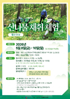 영양군 관계자는 “산나물채취체험행사는 자연 속에서 직접 봄을 느낄 수 있는 대표 체험 프로그램으로, 영양산나물축제를 더욱 풍성하게 만드는 중요한 콘텐츠”라며 “참가자들이 일월산의 자연을 체험하며 산나물의 매력을 직접 느낄 수 있기를 기대한다”라고 밝혔다.