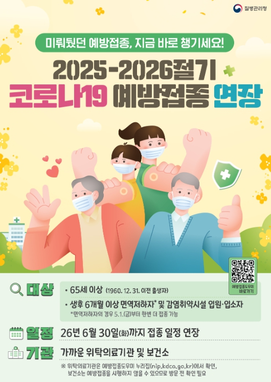이번 조치는 여름철 코로나19 유행 가능성에 대비하기 위한 것으로, 접종 대상자는 2025-2026절기 코로나19 백신을 아직 접종하지 않은 65세 이상 어르신 및 면역저하자, 감염취약시설 입원·입소자다.