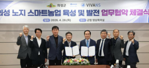 의성군은 28일 군청 영상회의실에서 스마트농업 솔루션 전문기업 ㈜비바엔에스(대표이사 김영식)와 ‘노지 스마트농업 육성 및 발전을 위한 업무협약(MOU)’을 체결했다고 밝혔다.
