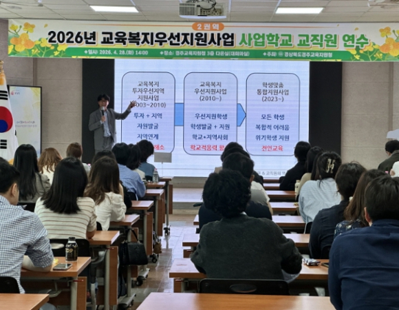 경상북도경주교육지원청은 2026년 4월 28일 경주교육지원청 다온실(3층 대회의실)에서 ‘2026년 교육복지우선지원사업 2권역 사업학교 교직원 연수’를 개최했다.